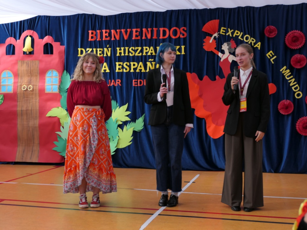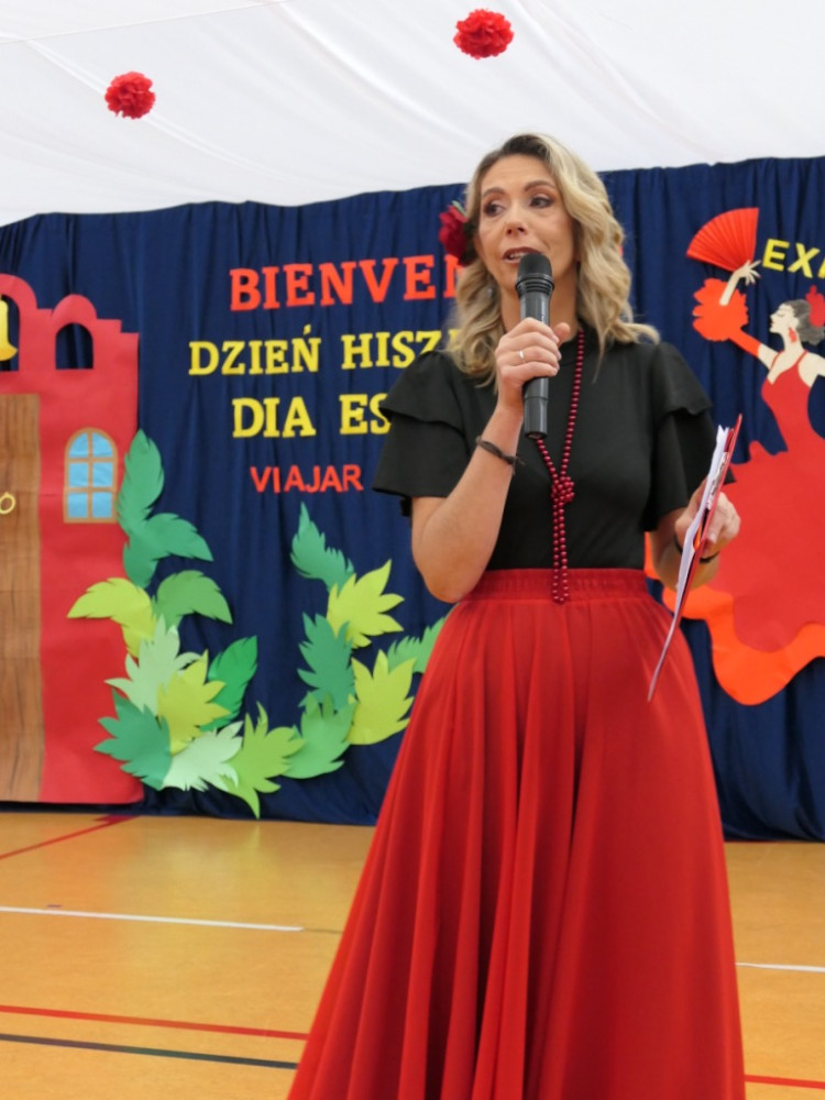 Następnie, na sali gimnastycznej, odbyła się część oficjalna. Była to okazja do zaprezentowania efektów naszej pracy w programie Erasmus+. Publiczność obejrzała prezentacje podsumowujące wyjazdy nauczycieli i uczniów do Hiszpanii, które pokazały, jak wiele nauczyliśmy się o tamtejszej kulturze i systemie edukacji. Nie zabrakło również akcentów artystycznych: wspaniałych pokazów tanecznych oraz pokazowych lekcji hiszpańskiego w formie muzycznej, które udowodniły, że nauka języka może być świetną zabawą!