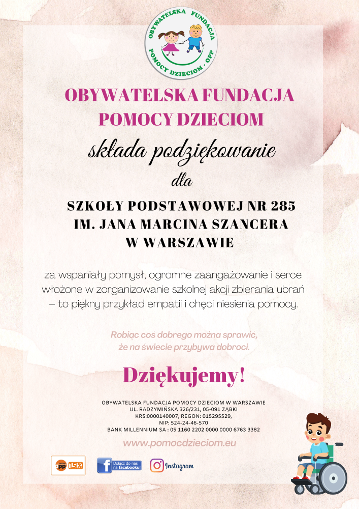 W Szkole Podstawowej nr 285 w Warszawie zakończyła się akcja zbiórki odzieży, przeprowadzona we współpracy z Obywatelską Fundacją Pomocy Dzieciom. Dzięki zaangażowaniu uczniów, rodziców i nauczycieli udało się zebrać wiele ubrań, które trafią do osób potrzebujących.